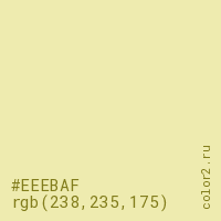 Цвет #EEEBAF в цветовой модели RGB обозначается тремя октетами (238, 235, 175) в десятичном формате и #EEEBAF в шестнадцатиричном (hex) формате, которые являются интенсивностью красного 238 (hex EE), интенсивность зелёного 235 (hex EB) и интенсивность синего 175 (hex AF).