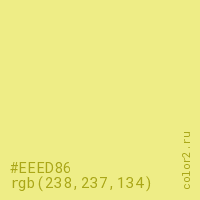 Цвет #EEED86 в цветовой модели RGB обозначается тремя октетами (238, 237, 134) в десятичном формате и #EEED86 в шестнадцатиричном (hex) формате, которые являются интенсивностью красного 238 (hex EE), интенсивность зелёного 237 (hex ED) и интенсивность синего 134 (hex 86).