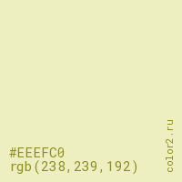 Цвет #EEEFC0 в цветовой модели RGB обозначается тремя октетами (238, 239, 192) в десятичном формате и #EEEFC0 в шестнадцатиричном (hex) формате, которые являются интенсивностью красного 238 (hex EE), интенсивность зелёного 239 (hex EF) и интенсивность синего 192 (hex C0).