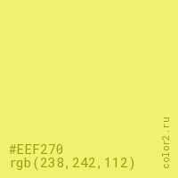 Цвет #EEF270 в цветовой модели RGB обозначается тремя октетами (238, 242, 112) в десятичном формате и #EEF270 в шестнадцатиричном (hex) формате, которые являются интенсивностью красного 238 (hex EE), интенсивность зелёного 242 (hex F2) и интенсивность синего 112 (hex 70).
