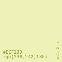 Цвет #EEF2B9 в цветовой модели RGB обозначается тремя октетами (238, 242, 185) в десятичном формате и #EEF2B9 в шестнадцатиричном (hex) формате, которые являются интенсивностью красного 238 (hex EE), интенсивность зелёного 242 (hex F2) и интенсивность синего 185 (hex B9).