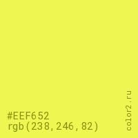 Цвет #EEF652 в цветовой модели RGB обозначается тремя октетами (238, 246, 82) в десятичном формате и #EEF652 в шестнадцатиричном (hex) формате, которые являются интенсивностью красного 238 (hex EE), интенсивность зелёного 246 (hex F6) и интенсивность синего 82 (hex 52).