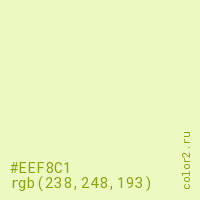 Цвет #EEF8C1 в цветовой модели RGB обозначается тремя октетами (238, 248, 193) в десятичном формате и #EEF8C1 в шестнадцатиричном (hex) формате, которые являются интенсивностью красного 238 (hex EE), интенсивность зелёного 248 (hex F8) и интенсивность синего 193 (hex C1).