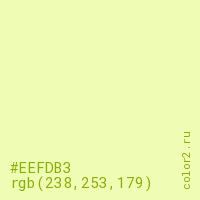 Цвет #EEFDB3 в цветовой модели RGB обозначается тремя октетами (238, 253, 179) в десятичном формате и #EEFDB3 в шестнадцатиричном (hex) формате, которые являются интенсивностью красного 238 (hex EE), интенсивность зелёного 253 (hex FD) и интенсивность синего 179 (hex B3).