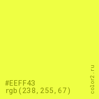 Цвет #EEFF43 в цветовой модели RGB обозначается тремя октетами (238, 255, 67) в десятичном формате и #EEFF43 в шестнадцатиричном (hex) формате, которые являются интенсивностью красного 238 (hex EE), интенсивность зелёного 255 (hex FF) и интенсивность синего 67 (hex 43).
