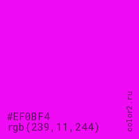 Цвет #EF0BF4 в цветовой модели RGB обозначается тремя октетами (239, 11, 244) в десятичном формате и #EF0BF4 в шестнадцатиричном (hex) формате, которые являются интенсивностью красного 239 (hex EF), интенсивность зелёного 11 (hex 0B) и интенсивность синего 244 (hex F4).