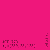 Цвет #EF177B в цветовой модели RGB обозначается тремя октетами (239, 23, 123) в десятичном формате и #EF177B в шестнадцатиричном (hex) формате, которые являются интенсивностью красного 239 (hex EF), интенсивность зелёного 23 (hex 17) и интенсивность синего 123 (hex 7B).