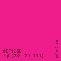 Цвет #EF1D8B в цветовой модели RGB обозначается тремя октетами (239, 29, 139) в десятичном формате и #EF1D8B в шестнадцатиричном (hex) формате, которые являются интенсивностью красного 239 (hex EF), интенсивность зелёного 29 (hex 1D) и интенсивность синего 139 (hex 8B).