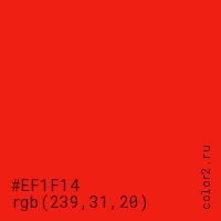 Цвет #EF1F14 в цветовой модели RGB обозначается тремя октетами (239, 31, 20) в десятичном формате и #EF1F14 в шестнадцатиричном (hex) формате, которые являются интенсивностью красного 239 (hex EF), интенсивность зелёного 31 (hex 1F) и интенсивность синего 20 (hex 14).