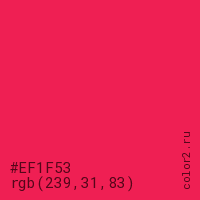 Цвет #EF1F53 в цветовой модели RGB обозначается тремя октетами (239, 31, 83) в десятичном формате и #EF1F53 в шестнадцатиричном (hex) формате, которые являются интенсивностью красного 239 (hex EF), интенсивность зелёного 31 (hex 1F) и интенсивность синего 83 (hex 53).