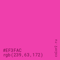 Цвет #EF3FAC в цветовой модели RGB обозначается тремя октетами (239, 63, 172) в десятичном формате и #EF3FAC в шестнадцатиричном (hex) формате, которые являются интенсивностью красного 239 (hex EF), интенсивность зелёного 63 (hex 3F) и интенсивность синего 172 (hex AC).