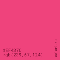 Цвет #EF437C в цветовой модели RGB обозначается тремя октетами (239, 67, 124) в десятичном формате и #EF437C в шестнадцатиричном (hex) формате, которые являются интенсивностью красного 239 (hex EF), интенсивность зелёного 67 (hex 43) и интенсивность синего 124 (hex 7C).