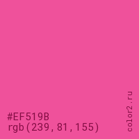 Цвет #EF519B в цветовой модели RGB обозначается тремя октетами (239, 81, 155) в десятичном формате и #EF519B в шестнадцатиричном (hex) формате, которые являются интенсивностью красного 239 (hex EF), интенсивность зелёного 81 (hex 51) и интенсивность синего 155 (hex 9B).