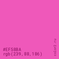 Цвет #EF58BA в цветовой модели RGB обозначается тремя октетами (239, 88, 186) в десятичном формате и #EF58BA в шестнадцатиричном (hex) формате, которые являются интенсивностью красного 239 (hex EF), интенсивность зелёного 88 (hex 58) и интенсивность синего 186 (hex BA).