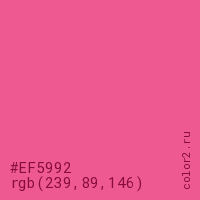 Цвет #EF5992 в цветовой модели RGB обозначается тремя октетами (239, 89, 146) в десятичном формате и #EF5992 в шестнадцатиричном (hex) формате, которые являются интенсивностью красного 239 (hex EF), интенсивность зелёного 89 (hex 59) и интенсивность синего 146 (hex 92).