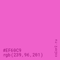 Цвет #EF60C9 в цветовой модели RGB обозначается тремя октетами (239, 96, 201) в десятичном формате и #EF60C9 в шестнадцатиричном (hex) формате, которые являются интенсивностью красного 239 (hex EF), интенсивность зелёного 96 (hex 60) и интенсивность синего 201 (hex C9).