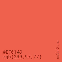 Цвет #EF614D в цветовой модели RGB обозначается тремя октетами (239, 97, 77) в десятичном формате и #EF614D в шестнадцатиричном (hex) формате, которые являются интенсивностью красного 239 (hex EF), интенсивность зелёного 97 (hex 61) и интенсивность синего 77 (hex 4D).
