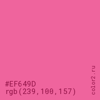 Цвет #EF649D в цветовой модели RGB обозначается тремя октетами (239, 100, 157) в десятичном формате и #EF649D в шестнадцатиричном (hex) формате, которые являются интенсивностью красного 239 (hex EF), интенсивность зелёного 100 (hex 64) и интенсивность синего 157 (hex 9D).