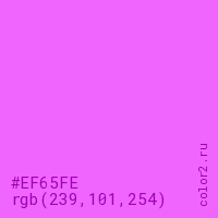 Цвет #EF65FE в цветовой модели RGB обозначается тремя октетами (239, 101, 254) в десятичном формате и #EF65FE в шестнадцатиричном (hex) формате, которые являются интенсивностью красного 239 (hex EF), интенсивность зелёного 101 (hex 65) и интенсивность синего 254 (hex FE).