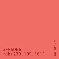 Цвет #EF6D65 в цветовой модели RGB обозначается тремя октетами (239, 109, 101) в десятичном формате и #EF6D65 в шестнадцатиричном (hex) формате, которые являются интенсивностью красного 239 (hex EF), интенсивность зелёного 109 (hex 6D) и интенсивность синего 101 (hex 65).
