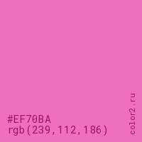 Цвет #EF70BA в цветовой модели RGB обозначается тремя октетами (239, 112, 186) в десятичном формате и #EF70BA в шестнадцатиричном (hex) формате, которые являются интенсивностью красного 239 (hex EF), интенсивность зелёного 112 (hex 70) и интенсивность синего 186 (hex BA).