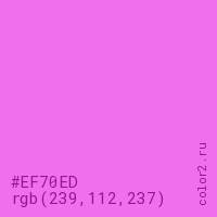 Цвет #EF70ED в цветовой модели RGB обозначается тремя октетами (239, 112, 237) в десятичном формате и #EF70ED в шестнадцатиричном (hex) формате, которые являются интенсивностью красного 239 (hex EF), интенсивность зелёного 112 (hex 70) и интенсивность синего 237 (hex ED).