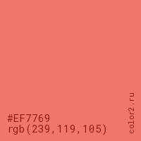 Цвет #EF7769 в цветовой модели RGB обозначается тремя октетами (239, 119, 105) в десятичном формате и #EF7769 в шестнадцатиричном (hex) формате, которые являются интенсивностью красного 239 (hex EF), интенсивность зелёного 119 (hex 77) и интенсивность синего 105 (hex 69).
