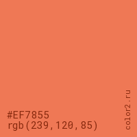 Цвет #EF7855 в цветовой модели RGB обозначается тремя октетами (239, 120, 85) в десятичном формате и #EF7855 в шестнадцатиричном (hex) формате, которые являются интенсивностью красного 239 (hex EF), интенсивность зелёного 120 (hex 78) и интенсивность синего 85 (hex 55).
