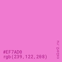 Цвет #EF7AD0 в цветовой модели RGB обозначается тремя октетами (239, 122, 208) в десятичном формате и #EF7AD0 в шестнадцатиричном (hex) формате, которые являются интенсивностью красного 239 (hex EF), интенсивность зелёного 122 (hex 7A) и интенсивность синего 208 (hex D0).
