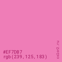 Цвет #EF7DB7 в цветовой модели RGB обозначается тремя октетами (239, 125, 183) в десятичном формате и #EF7DB7 в шестнадцатиричном (hex) формате, которые являются интенсивностью красного 239 (hex EF), интенсивность зелёного 125 (hex 7D) и интенсивность синего 183 (hex B7).