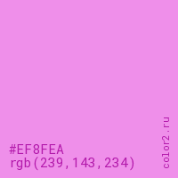 Цвет #EF8FEA в цветовой модели RGB обозначается тремя октетами (239, 143, 234) в десятичном формате и #EF8FEA в шестнадцатиричном (hex) формате, которые являются интенсивностью красного 239 (hex EF), интенсивность зелёного 143 (hex 8F) и интенсивность синего 234 (hex EA).