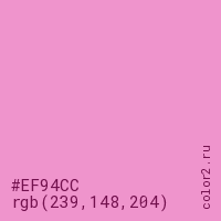 Цвет #EF94CC в цветовой модели RGB обозначается тремя октетами (239, 148, 204) в десятичном формате и #EF94CC в шестнадцатиричном (hex) формате, которые являются интенсивностью красного 239 (hex EF), интенсивность зелёного 148 (hex 94) и интенсивность синего 204 (hex CC).