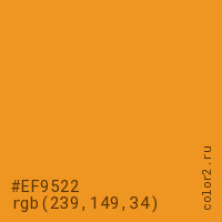Цвет #EF9522 в цветовой модели RGB обозначается тремя октетами (239, 149, 34) в десятичном формате и #EF9522 в шестнадцатиричном (hex) формате, которые являются интенсивностью красного 239 (hex EF), интенсивность зелёного 149 (hex 95) и интенсивность синего 34 (hex 22).
