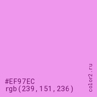 Цвет #EF97EC в цветовой модели RGB обозначается тремя октетами (239, 151, 236) в десятичном формате и #EF97EC в шестнадцатиричном (hex) формате, которые являются интенсивностью красного 239 (hex EF), интенсивность зелёного 151 (hex 97) и интенсивность синего 236 (hex EC).