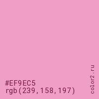 Цвет #EF9EC5 в цветовой модели RGB обозначается тремя октетами (239, 158, 197) в десятичном формате и #EF9EC5 в шестнадцатиричном (hex) формате, которые являются интенсивностью красного 239 (hex EF), интенсивность зелёного 158 (hex 9E) и интенсивность синего 197 (hex C5).