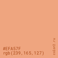 Цвет #EFA57F в цветовой модели RGB обозначается тремя октетами (239, 165, 127) в десятичном формате и #EFA57F в шестнадцатиричном (hex) формате, которые являются интенсивностью красного 239 (hex EF), интенсивность зелёного 165 (hex A5) и интенсивность синего 127 (hex 7F).