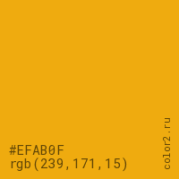 Цвет #EFAB0F в цветовой модели RGB обозначается тремя октетами (239, 171, 15) в десятичном формате и #EFAB0F в шестнадцатиричном (hex) формате, которые являются интенсивностью красного 239 (hex EF), интенсивность зелёного 171 (hex AB) и интенсивность синего 15 (hex 0F).