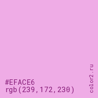 Цвет #EFACE6 в цветовой модели RGB обозначается тремя октетами (239, 172, 230) в десятичном формате и #EFACE6 в шестнадцатиричном (hex) формате, которые являются интенсивностью красного 239 (hex EF), интенсивность зелёного 172 (hex AC) и интенсивность синего 230 (hex E6).