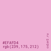 Цвет #EFAFD4 в цветовой модели RGB обозначается тремя октетами (239, 175, 212) в десятичном формате и #EFAFD4 в шестнадцатиричном (hex) формате, которые являются интенсивностью красного 239 (hex EF), интенсивность зелёного 175 (hex AF) и интенсивность синего 212 (hex D4).