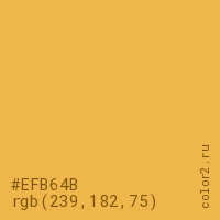 Цвет #EFB64B в цветовой модели RGB обозначается тремя октетами (239, 182, 75) в десятичном формате и #EFB64B в шестнадцатиричном (hex) формате, которые являются интенсивностью красного 239 (hex EF), интенсивность зелёного 182 (hex B6) и интенсивность синего 75 (hex 4B).