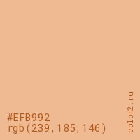 Цвет #EFB992 в цветовой модели RGB обозначается тремя октетами (239, 185, 146) в десятичном формате и #EFB992 в шестнадцатиричном (hex) формате, которые являются интенсивностью красного 239 (hex EF), интенсивность зелёного 185 (hex B9) и интенсивность синего 146 (hex 92).