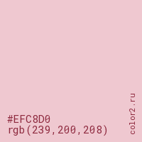 Цвет #EFC8D0 в цветовой модели RGB обозначается тремя октетами (239, 200, 208) в десятичном формате и #EFC8D0 в шестнадцатиричном (hex) формате, которые являются интенсивностью красного 239 (hex EF), интенсивность зелёного 200 (hex C8) и интенсивность синего 208 (hex D0).