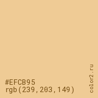 Цвет #EFCB95 в цветовой модели RGB обозначается тремя октетами (239, 203, 149) в десятичном формате и #EFCB95 в шестнадцатиричном (hex) формате, которые являются интенсивностью красного 239 (hex EF), интенсивность зелёного 203 (hex CB) и интенсивность синего 149 (hex 95).