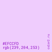 Цвет #EFCCFD в цветовой модели RGB обозначается тремя октетами (239, 204, 253) в десятичном формате и #EFCCFD в шестнадцатиричном (hex) формате, которые являются интенсивностью красного 239 (hex EF), интенсивность зелёного 204 (hex CC) и интенсивность синего 253 (hex FD).