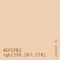 Цвет #EFCFB2 в цветовой модели RGB обозначается тремя октетами (239, 207, 178) в десятичном формате и #EFCFB2 в шестнадцатиричном (hex) формате, которые являются интенсивностью красного 239 (hex EF), интенсивность зелёного 207 (hex CF) и интенсивность синего 178 (hex B2).