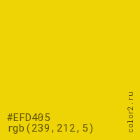Цвет #EFD405 в цветовой модели RGB обозначается тремя октетами (239, 212, 5) в десятичном формате и #EFD405 в шестнадцатиричном (hex) формате, которые являются интенсивностью красного 239 (hex EF), интенсивность зелёного 212 (hex D4) и интенсивность синего 5 (hex 05).