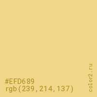 Цвет #EFD689 в цветовой модели RGB обозначается тремя октетами (239, 214, 137) в десятичном формате и #EFD689 в шестнадцатиричном (hex) формате, которые являются интенсивностью красного 239 (hex EF), интенсивность зелёного 214 (hex D6) и интенсивность синего 137 (hex 89).