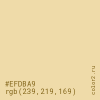 Цвет RGB(239, 219, 169) в процентом отношении количества цвета состоит из 93.7% красного (red), 85.9% зелёного (green) и 66.3% синего (blue).