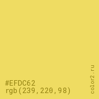 Цвет #EFDC62 в цветовой модели RGB обозначается тремя октетами (239, 220, 98) в десятичном формате и #EFDC62 в шестнадцатиричном (hex) формате, которые являются интенсивностью красного 239 (hex EF), интенсивность зелёного 220 (hex DC) и интенсивность синего 98 (hex 62).