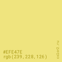 Цвет #EFE47E в цветовой модели RGB обозначается тремя октетами (239, 228, 126) в десятичном формате и #EFE47E в шестнадцатиричном (hex) формате, которые являются интенсивностью красного 239 (hex EF), интенсивность зелёного 228 (hex E4) и интенсивность синего 126 (hex 7E).